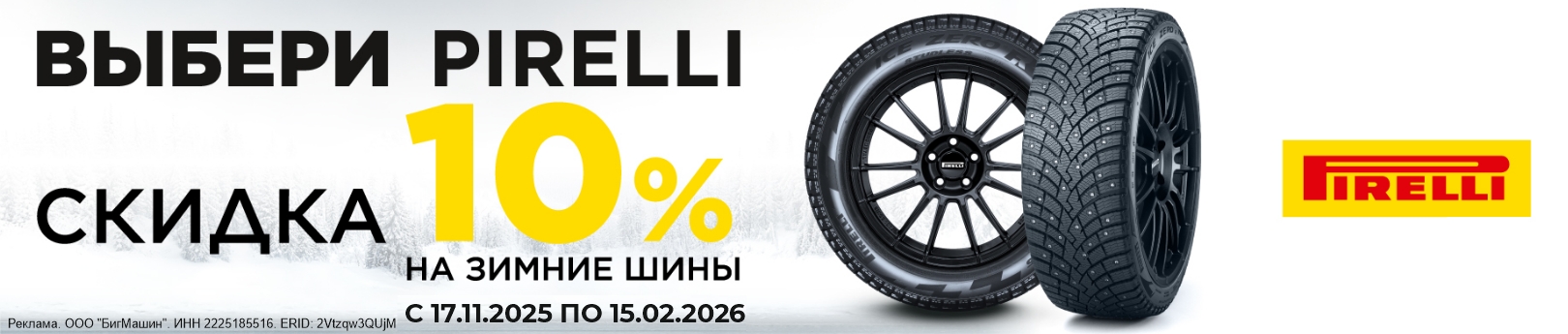 С 17 ноября по 15 февраля 2026 года выберите зимние шины Pirelli и получите скидку 10%. Ассортимент ограничен.